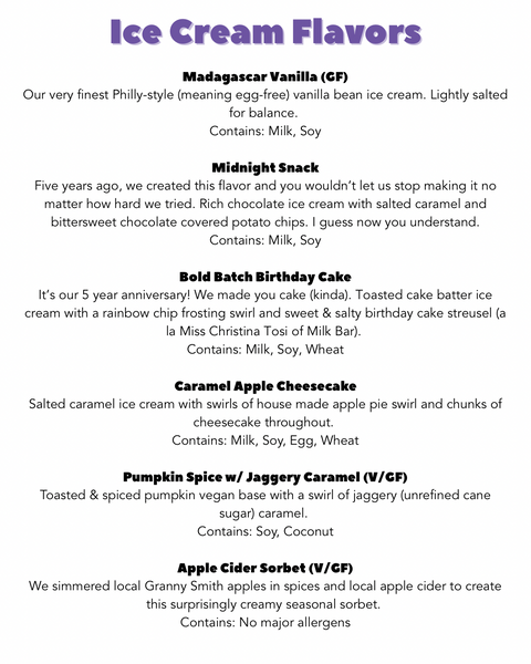 16oz of your favorite ice cream! Check the list for flavor descriptions and allergen information.